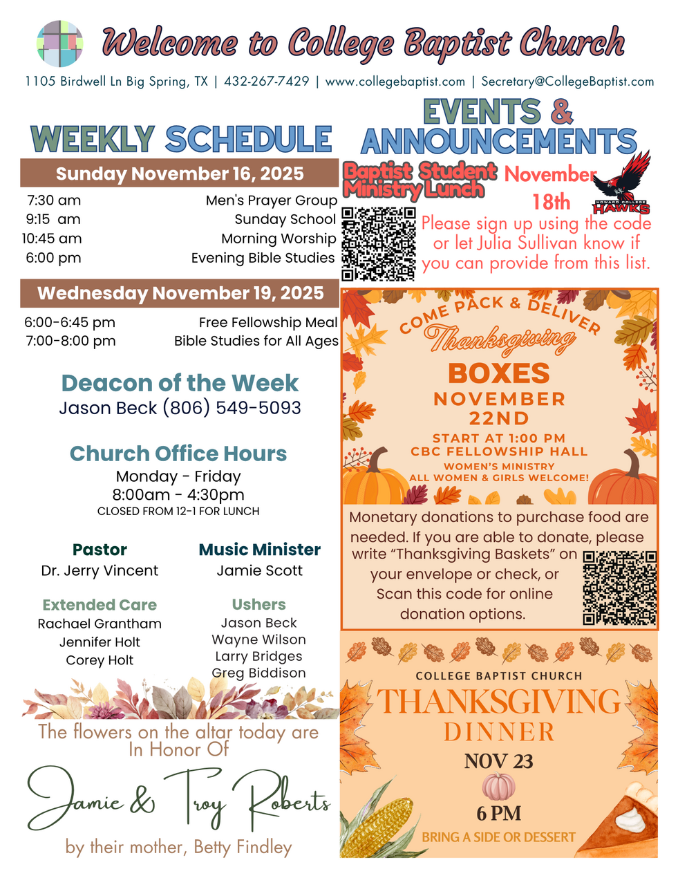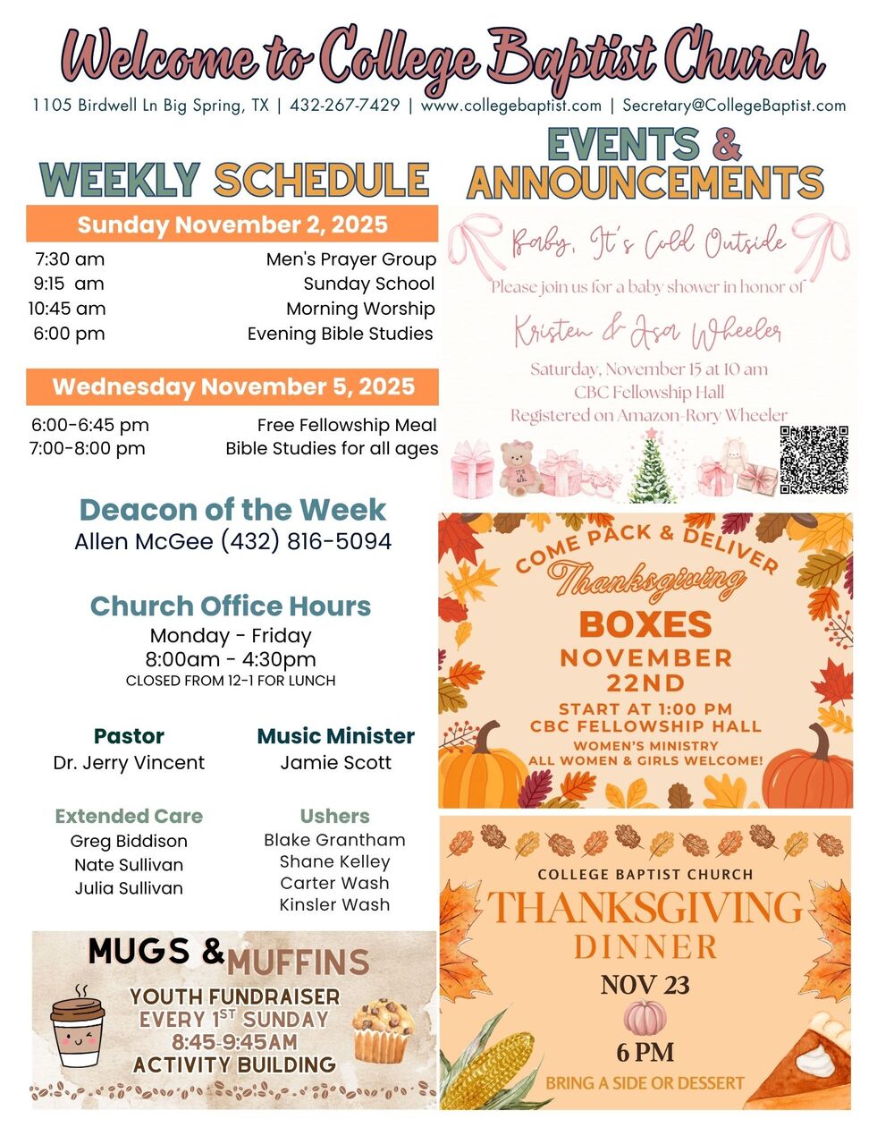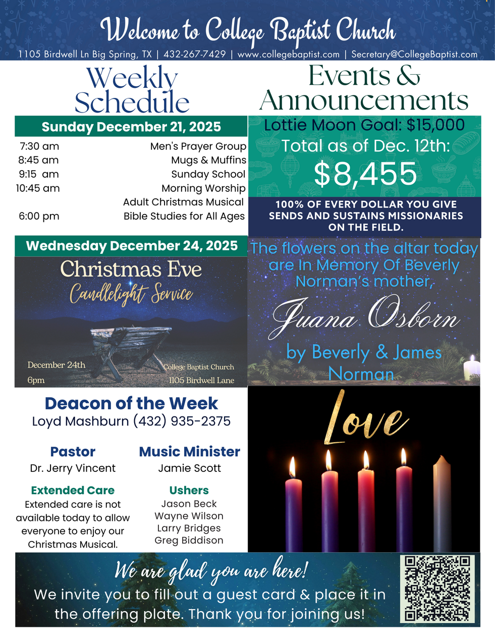 College Baptist Church is a medium-sized church located in Big Spring, TX. Our church was founded in 1955 and is associated with the